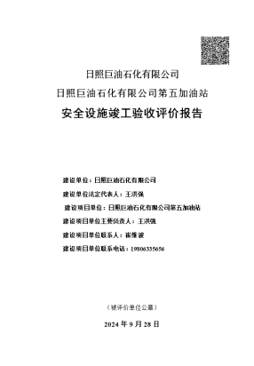 日照巨油石化有限公司成立于2022年08月23日,類型為其他有限責任公司,營業(yè)場所位于山東省日照市莒縣店子集街道銀杏大道金康醫(yī)院西北200米,法定代表人為王洪強。該公司為中國石化銷售股份有限公司和莒縣土地發(fā)展集團有限公司的合資公司。日照巨油石化有限公司第五加油站為日照巨油石化有限公司的分支機構(gòu),成立于2023年04月27日,類型為其他有限責任公司分公司,營業(yè)場所位于山東省日照市莒縣店子集街道日照路小學南200米,負責人為王洪強。 該站主要負責人為劉廷興,現(xiàn)有從業(yè)人員3人,成立了安全生產(chǎn)領導小組,配備了1名專職安全管理人員;主要負責人和安全管理人員均取得安全生產(chǎn)知識和管理能力考核合格證;其他從業(yè)人員經(jīng)本單位培訓考核合格。 依據(jù)建設單位提供的《安全設施設計專篇》及竣工圖,本次評價范圍內(nèi)包括以下設施:新建單層站房1座、罩棚1座(安裝3臺加油機,其中1臺92#汽油/柴油四槍雙油品加油機,1臺95#汽油/98#汽油四槍雙油品加油機,1臺92#汽油/95#汽油四槍雙油品加油機)、承重埋地罐區(qū)1處(設30m3汽油罐3臺,30 m3柴油罐1臺)、洗車機1座、50kVA箱變1座。 本項目于2024年4月開工建設,于2024年8月竣工。根據(jù)《山東省危險化學品建設項目安全監(jiān)督管理辦法實施細則》(魯安監(jiān)發(fā)[2018]17號)第二十六條 “項目投入使用前,建設單位應當組織驗收工作組進行安全設施竣工驗收,作出建設項目安全設施竣工驗收是否通過的結(jié)論。建設單位應當向參加驗收工作組提供下列文件、資料,并組織進行現(xiàn)場檢查:4.建設項目安全設施竣工驗收評價報告”的要求,日照巨油石化有限公司第五加油站委托山東應急安全技術(shù)服務公司對其日照巨油石化有限公司第五加油站進行安全設施竣工驗收評價工作。 安全評價結(jié)論: 綜合各項評價結(jié)果,評價組認為:在目前條件下,日照巨油石化有限公司日照巨油石化有限公司第五加油站具備安全驗收條件。 |